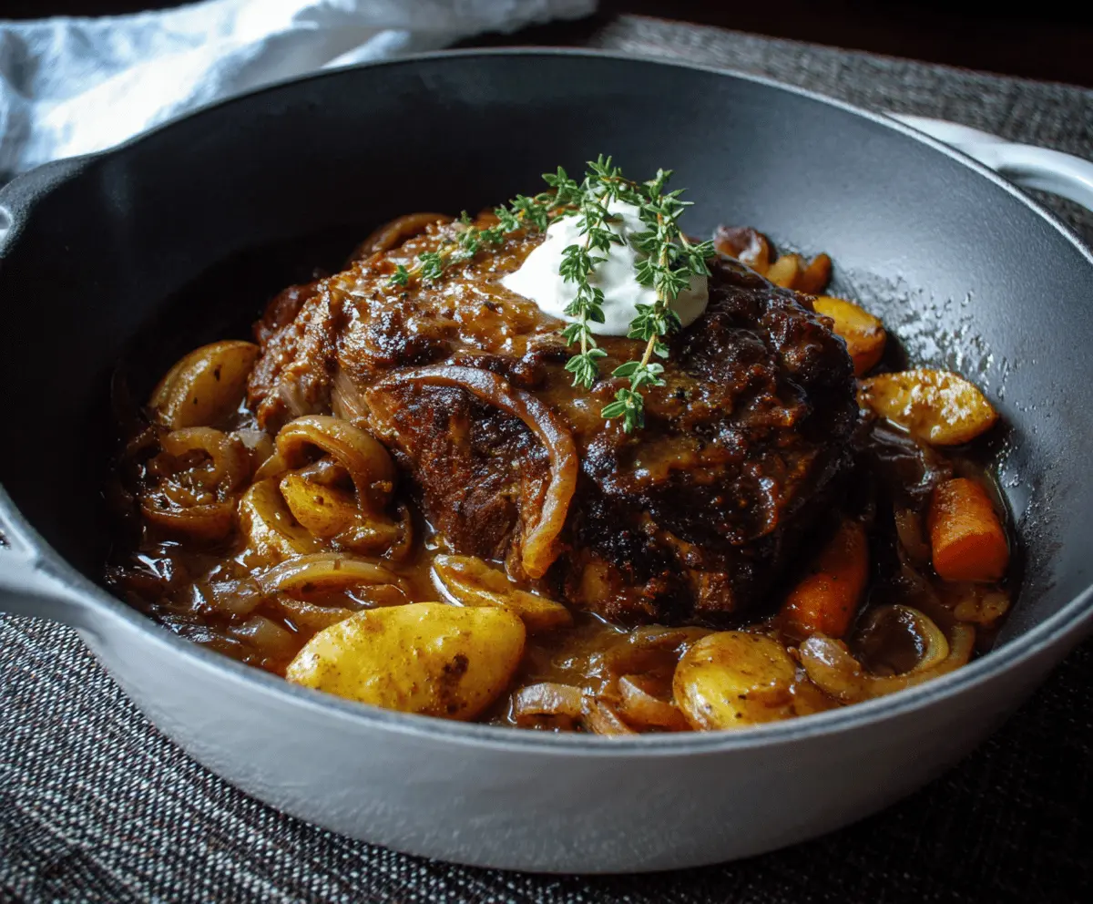 Carefully remove the pork from the pot and cover it loosely with foil to keep warm. Take out and discard the thyme. If you like, place the pot back on the stove over medium heat and simmer for about 10 minutes to reduce and thicken the sauce, stirring frequently. Serve the pork topped with a dollop of sour cream or crème fraîche and garnish with fresh thyme. Spoon the onions and sauce over the top and enjoy with mashed potatoes, roasted veggies, or crusty bread to soak up all that yum!