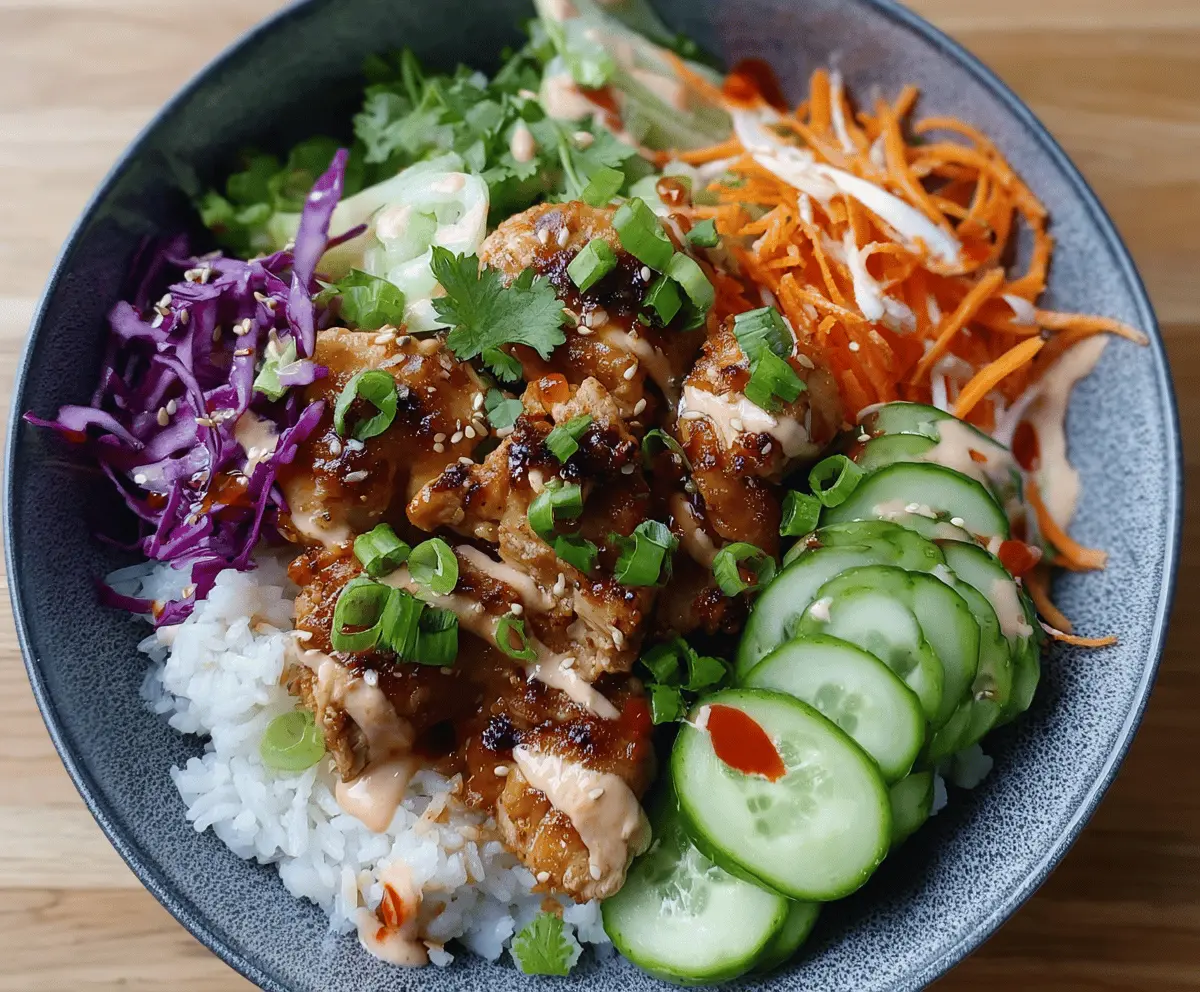 Bang Bang Chicken Bowl is a fresh and tasty dish that combines crispy chicken pieces coated in a creamy, spicy sauce with bright veggies and fluffy rice. The sauce has just the right kick of heat balanced by a touch of sweetness, making every bite exciting and flavorful. It’s a colorful bowl with crunchy cucumber, shredded carrots, and a sprinkle of green onions to keep things crisp and refreshing.