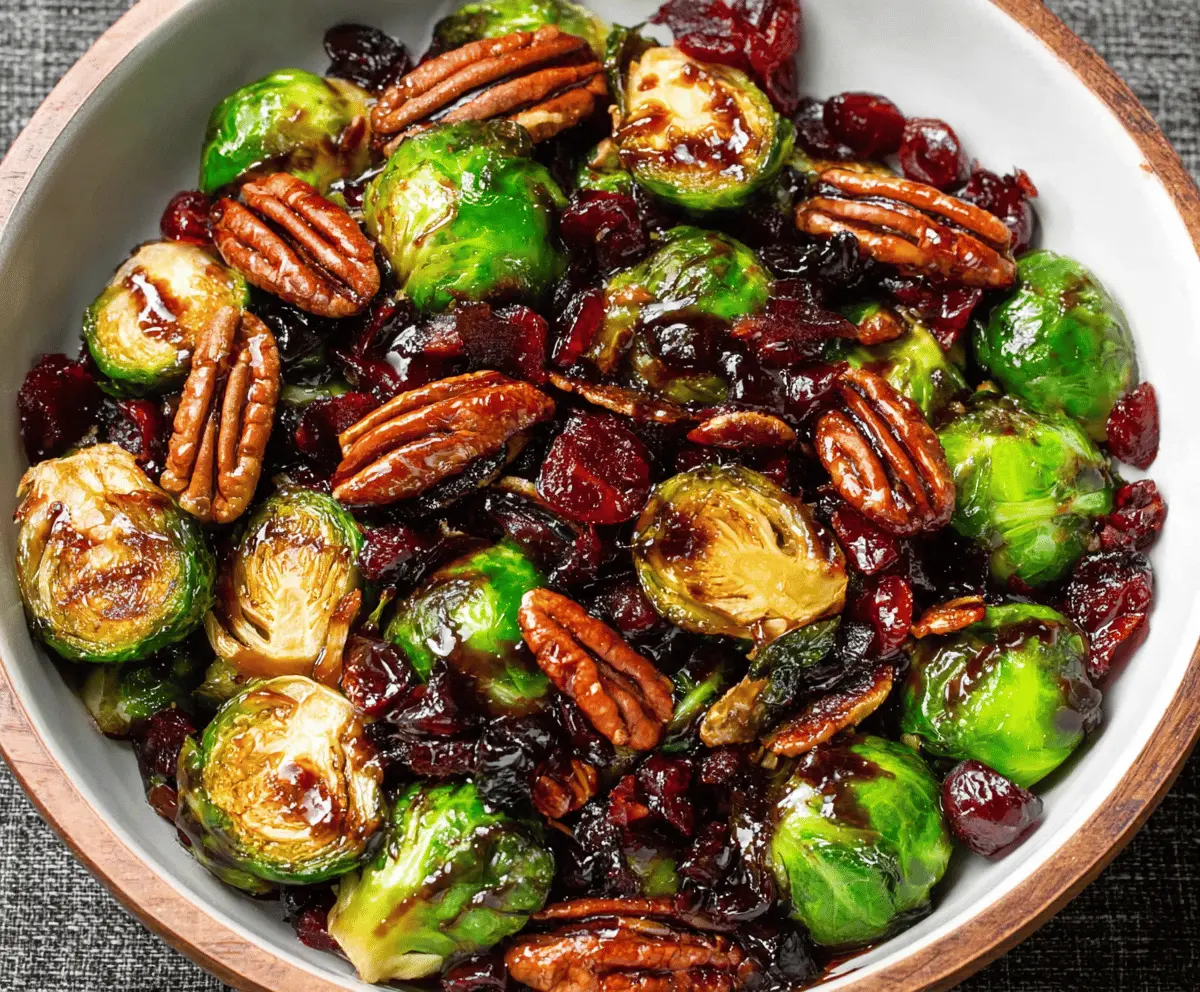 Brussels Sprouts with Bacon, Pecans, Cranberries, and Balsamic Glaze