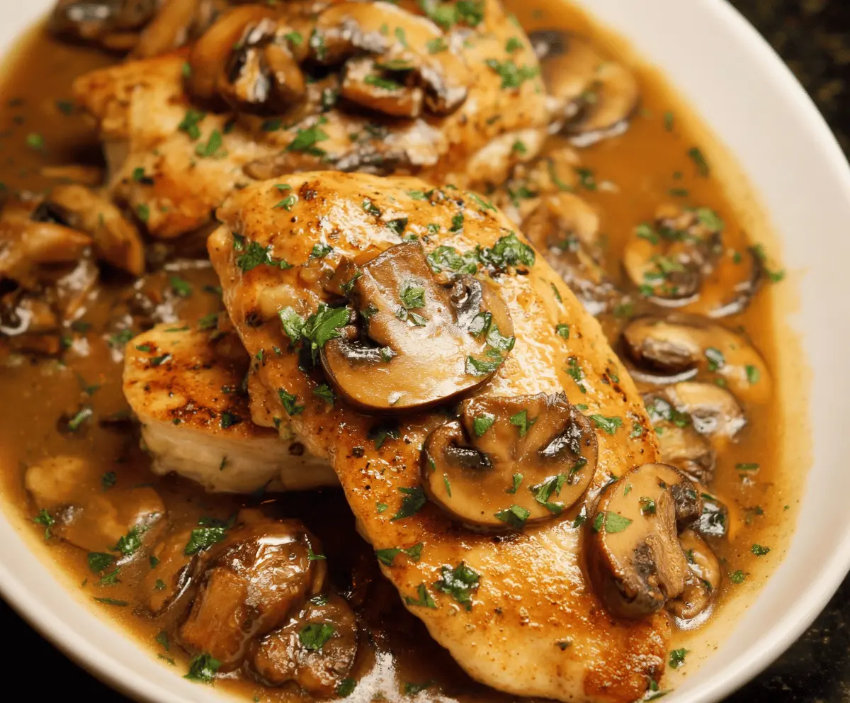 Put the chicken back into the skillet and cook for another 3 to 4 minutes, letting the chicken warm through and absorb the sauce. Sprinkle with chopped parsley for a fresh touch. Serve the chicken topped with the mushroom sauce.