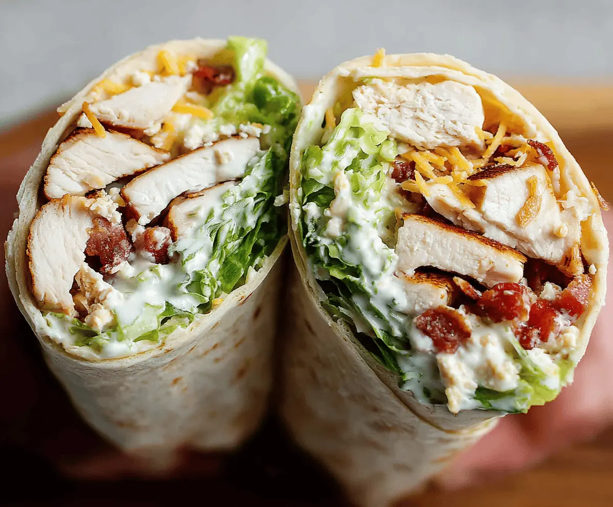 Delicious Chicken Ranch Wraps filled with grilled chicken, crisp lettuce, fresh tomatoes, and creamy ranch dressing in a soft tortilla.