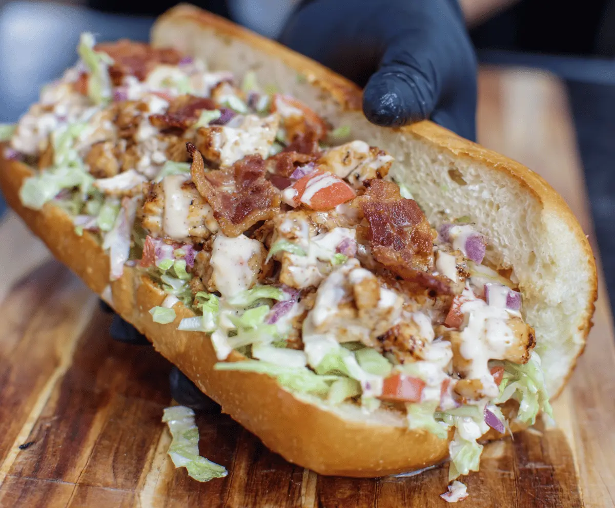Drizzle ranch dressing over the bowl ingredients and toss gently to coat everything evenly. Slice open the hoagie rolls but keep one side attached for a good hold. Fill each roll generously with the chicken mixture and bacon on top.