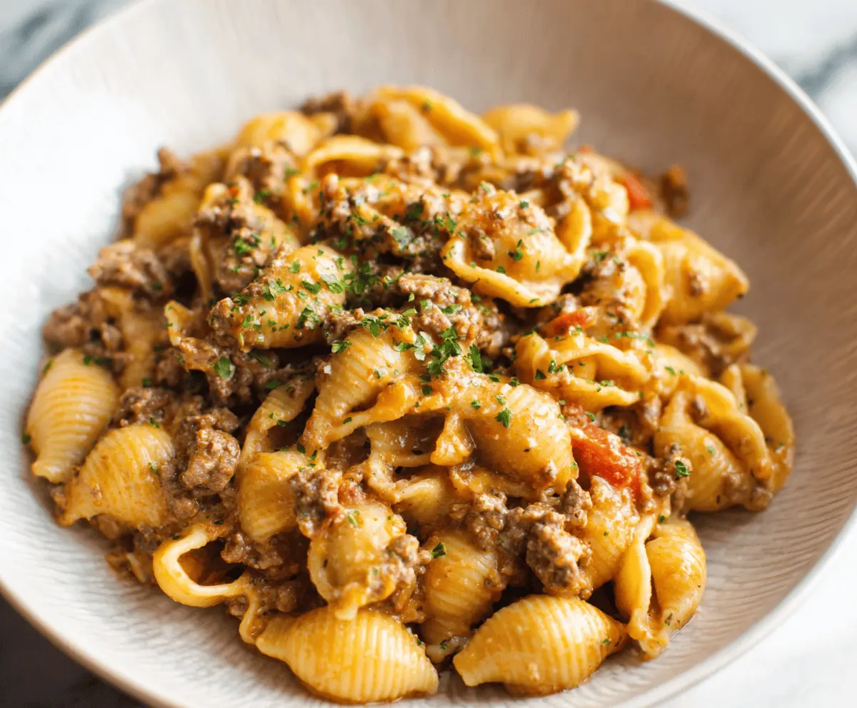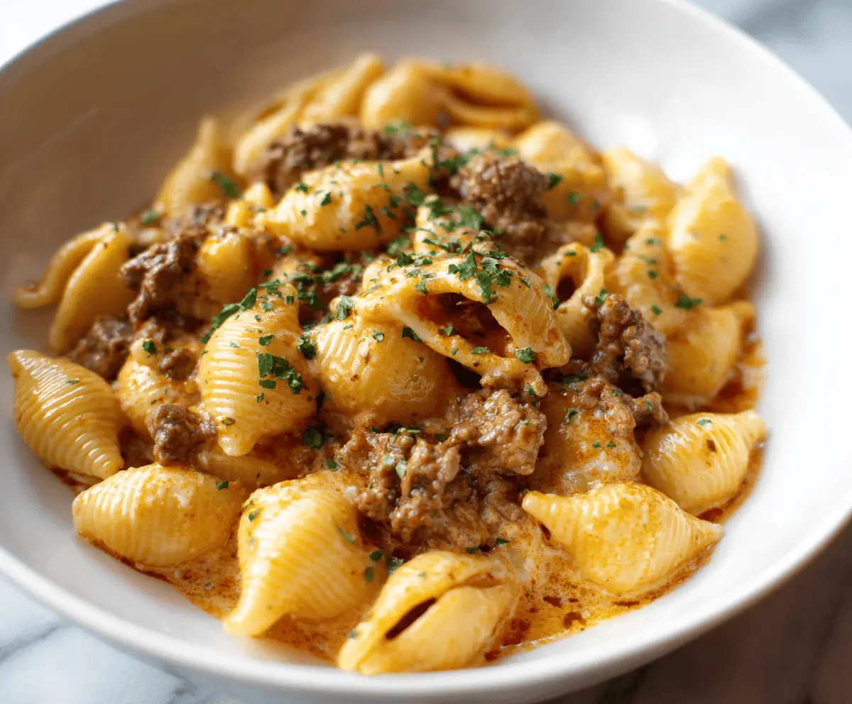 Taste and adjust the seasoning with more salt or pepper if needed. Serve the creamy beef and shells warm, topped with a sprinkle of fresh or dried parsley for a pop of color and freshness.