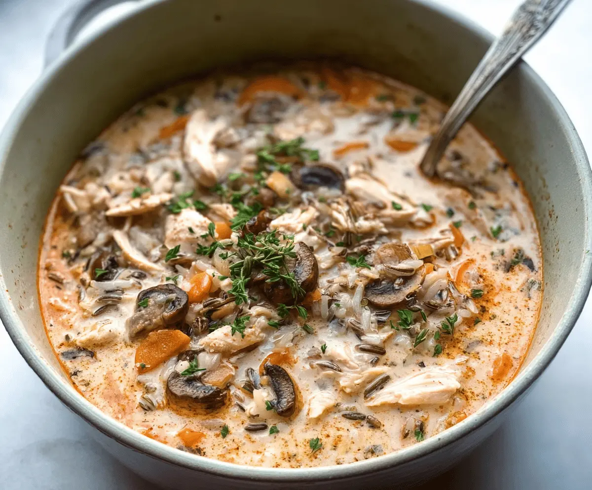 Creamy mushroom chicken and wild rice soup in a bowl garnished with herbs, showcasing a hearty and comforting meal
