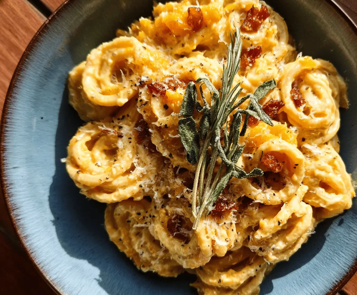 Plate the pasta and top with freshly grated Parmesan, chopped fresh sage or parsley, and crispy bacon or pancetta bits if desired. Finish off with some freshly cracked black pepper. Serve warm and enjoy your cozy, creamy meal!
