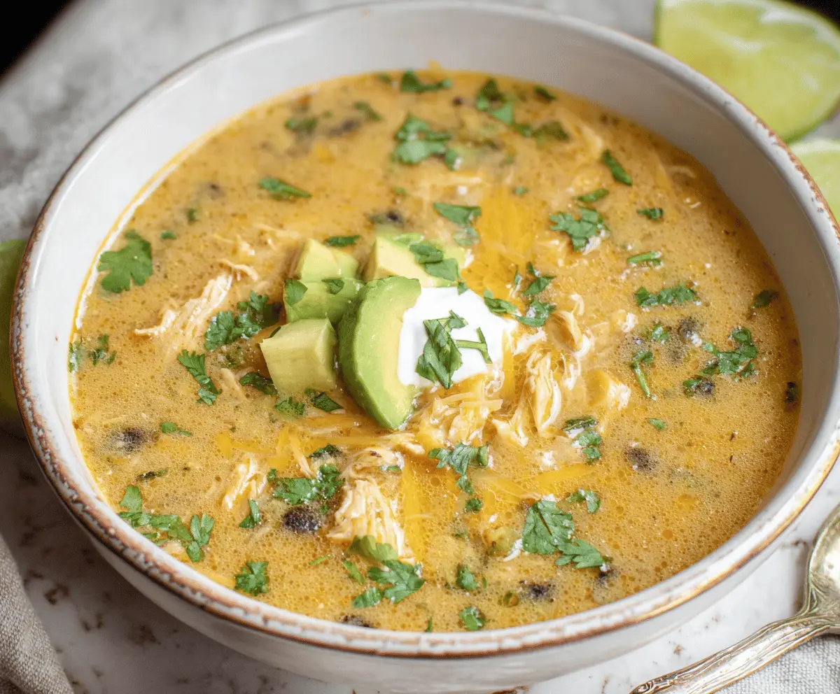 Serve your warm, creamy green enchilada chicken soup immediately and enjoy the comforting, zesty flavors!