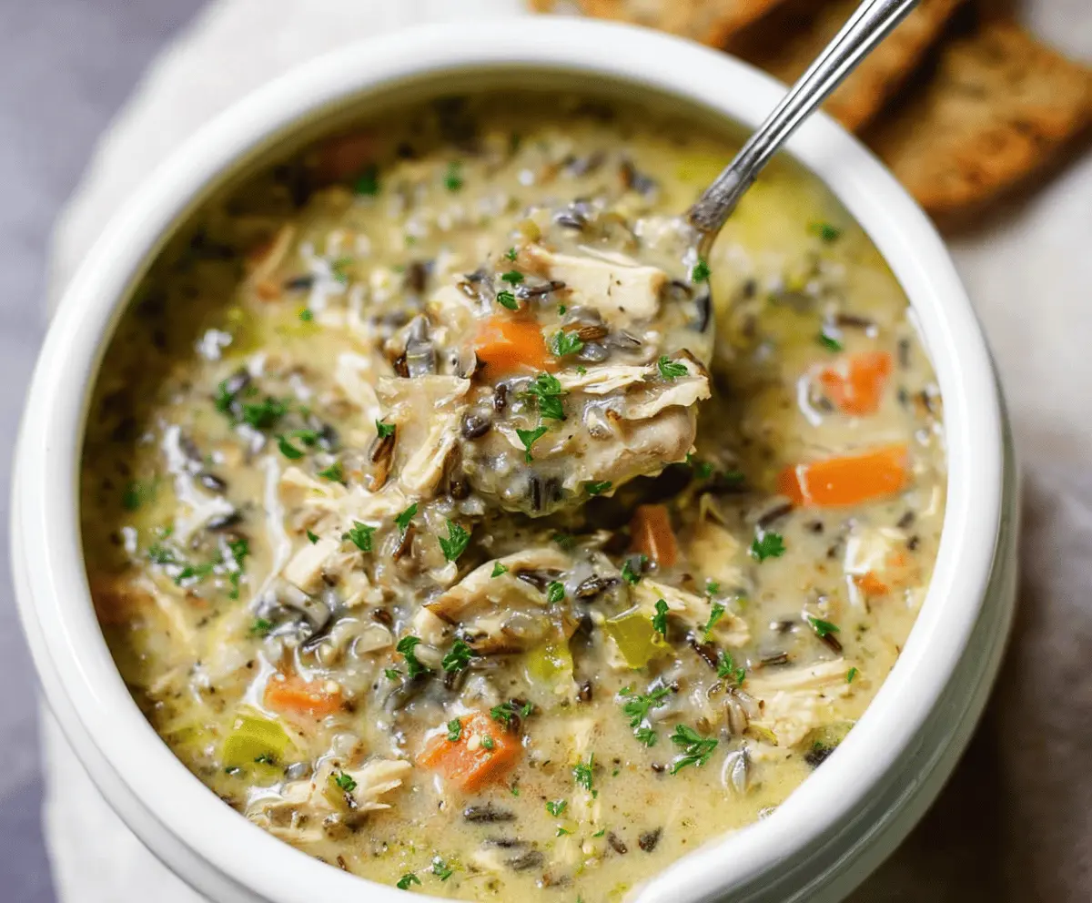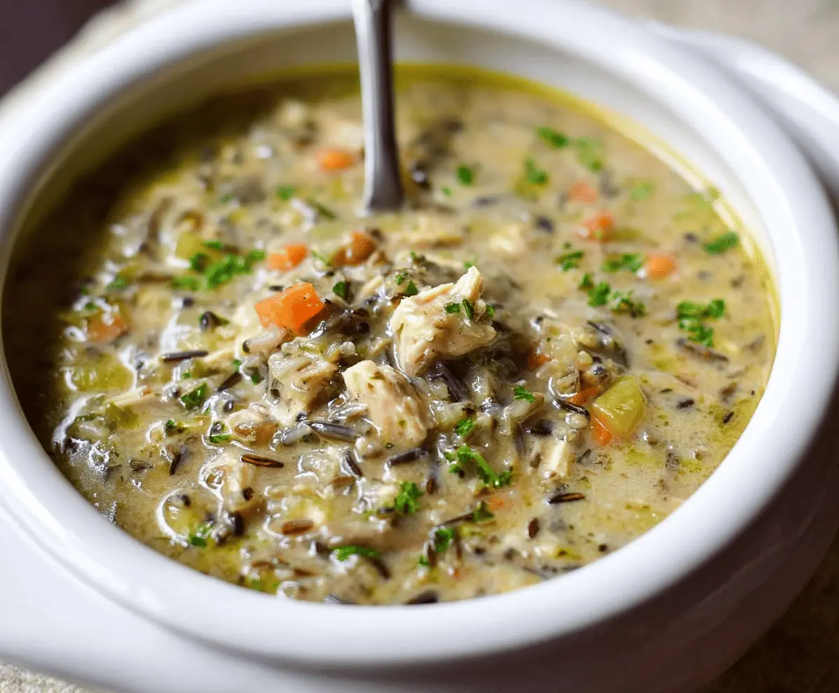 Creamy and nutritious healthy chicken wild rice soup with tender chicken pieces, wild rice, and fresh vegetables in a comforting broth.