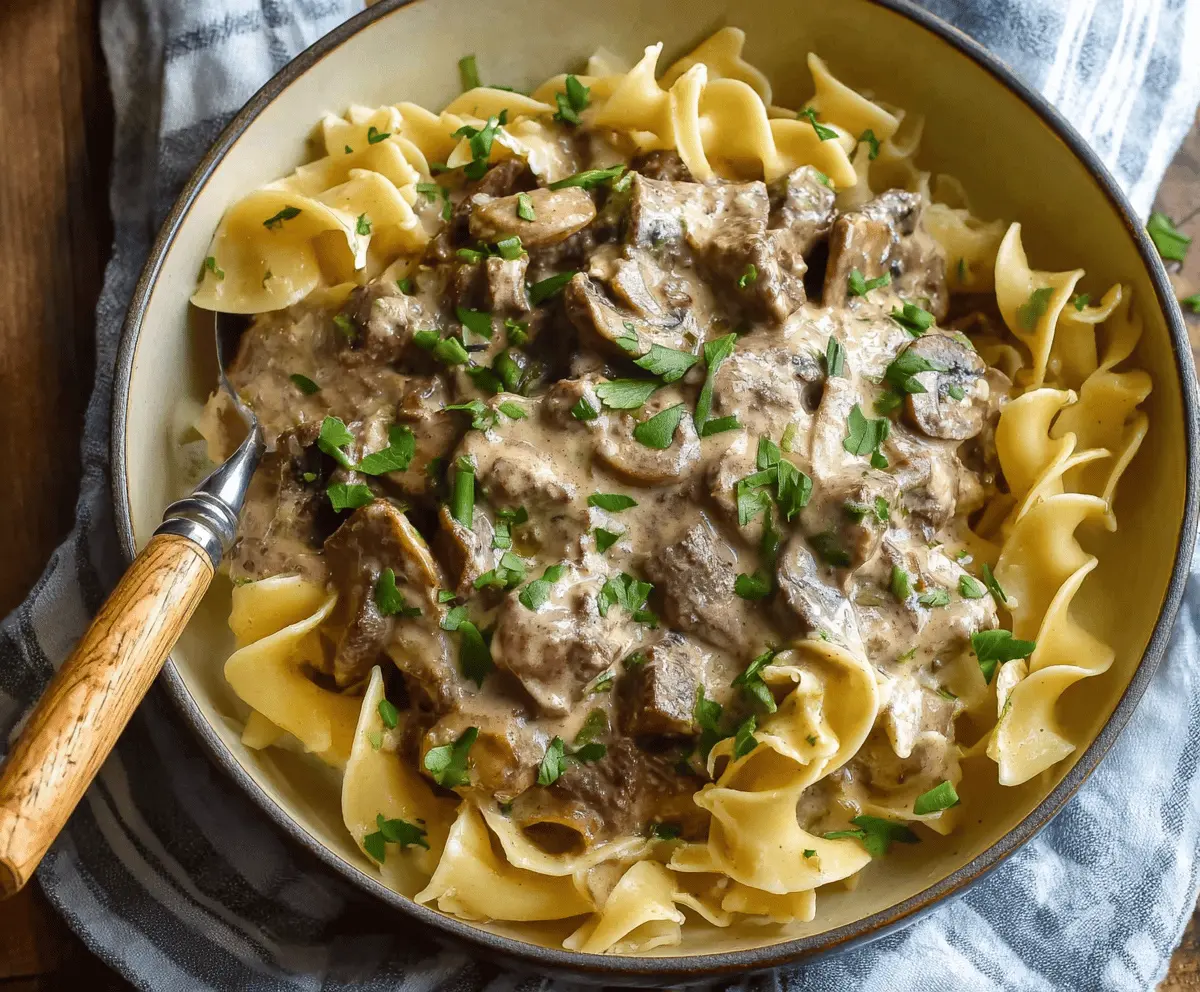 Creamy slow cooker beef stroganoff stew with tender beef, mushrooms, and savory sauce served in a bowl