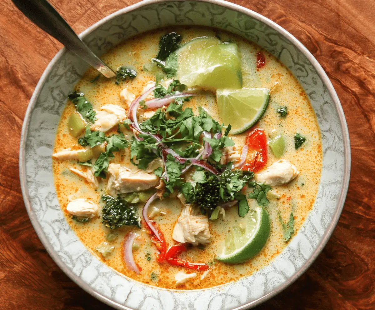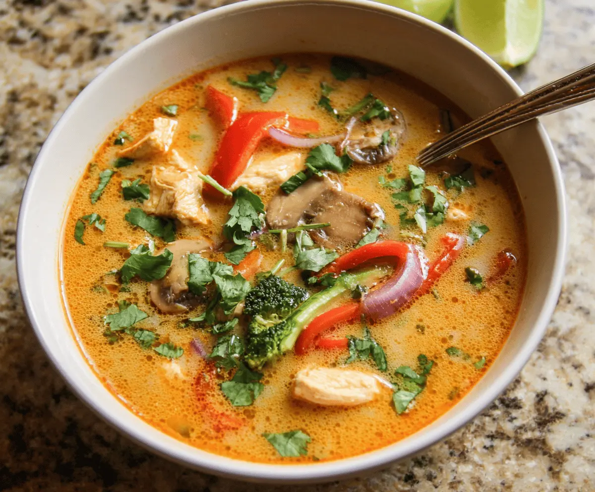 A steaming bowl of Thai Chicken Soup garnished with fresh herbs, lime, and vegetables, showcasing vibrant colors and flavorful ingredients.